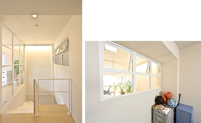 洋室(1)の窓から差し込んだ光は、室内窓を通じて、向かい側にあるお子さまの部屋〈洋室(2)〉にも届きます(画像左)。お子さまの部屋にも室内窓を設置することで、部屋で過ごすことが多いお子さまの様子を見守ることもでき、安心して過ごせるようになりました(画像右)。