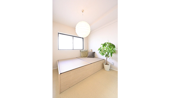 洋室(3)は、客間として使用されています。2階の内装は、奥さまのご要望で温かさを感じるインテリアでコーディネート。床材は、表面にセラミック混入塗料が塗布されたコルクタイルで統一しました。見た目だけではなく、肌ざわりにも温かみを感じるのが特徴です。