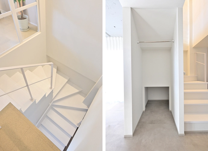 洋室(1)の窓から差し込んだ光は、階段も明るく照らします。階段下のスペースを有効活用し、収納も設置しました(画像右)。