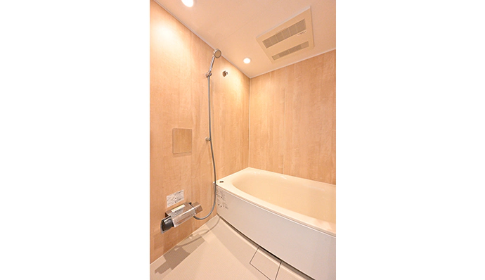 1階のリビングの広さを確保するために、浴室は2階に設置。2階のインテリアのイメージに合わせ、浴室も温かみのある木目調のパネルを基調にコーディネートしました。大きめの浴槽を採用し、リラックスできるくつろぎのスペースを実現できました。