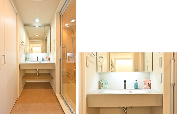 洗面室には、モダンな印象のコンクリート調の洗面カウンターを採用。水栓は空間にアクセントを加えるために、ブラックの塗装が施されたスタイリッシュな商品を選びました。また、新たに大きな収納スペースを設けたことで、タオルやご家族の洗面用具、下着類なども収納できるようになりました。