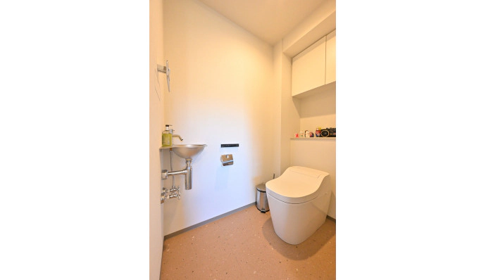 トイレには、洗面室と同じデザインのフロアタイルを採用し、床に統一感を持たせました。手洗い器は、クールな印象にしたいというご要望を反映し、すっきりとした印象の商品からご選定いただきました。