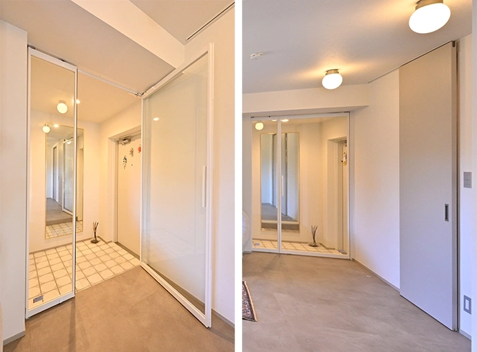 玄関からすぐにリビングへ入る動線となるため、玄関のたたきとリビングの間に扉を設け、空間をゆるやかに仕切りました。ガラス扉を採用することで視線が抜け、閉塞感を抑える工夫をしています。玄関収納の代わりに、リビングから直接出入りできる場所にシューズクロークを設置しました(画像右)。