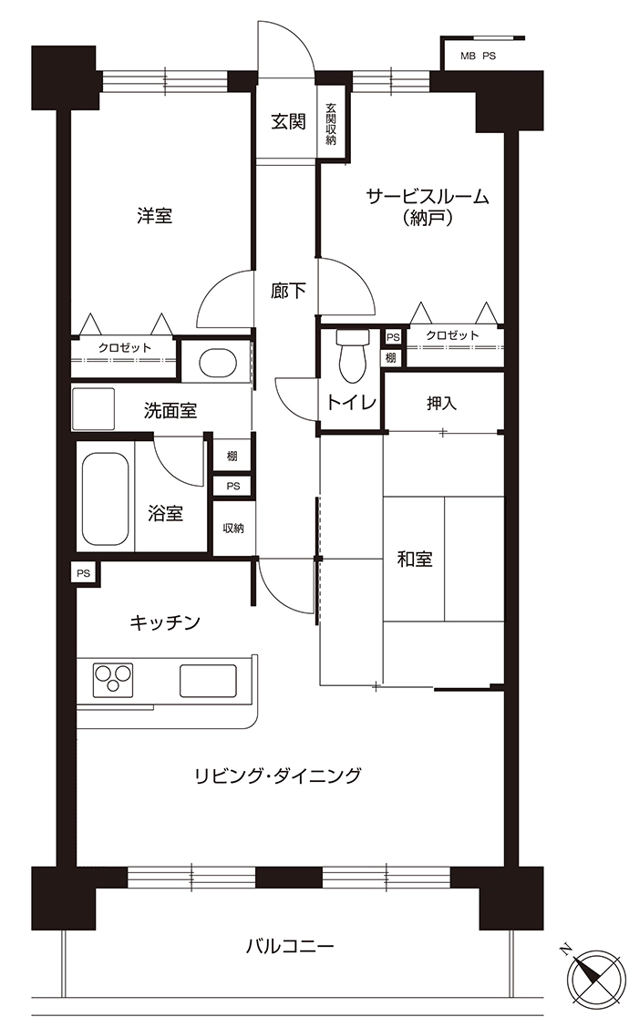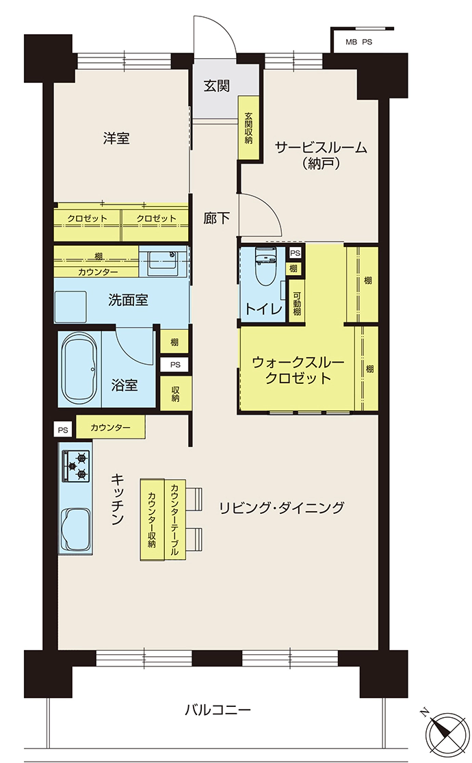 - 洋室収納、廊下収納、玄関収納、キッチンカウンター収納、カウンターテーブル、