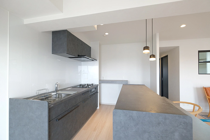 2列式キッチンのアイランド型カウンター収納は、通常より高さのあるものを採用し収納力を向上させました。また、キッチン横のスペースを利用して、キッチン家電を使いやすい高さに並べておける棚とコンセントを新設しました。