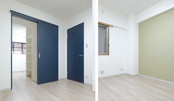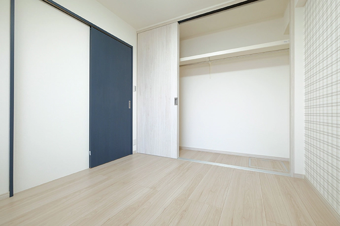 洋室は、ご主人さまの寝室です。収納を増やしたいというご希望に応え、クロゼットを拡張しました。クロゼットには横幅一杯のハンガーパイプを取り付け、お持ちの洋服を掛けて収納できるようにしました。また、紺色の建具を採用し空間のアクセントとしました。