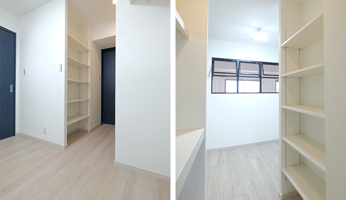 サービスルーム(納戸)と廊下から出入りできる、ウォークスルークロゼットを新設しました。お洋服やこれまで押入れにしまってあった寝具なども収納できるよう、棚の数や奥行きなどを十分に検討して造作しました。リビング・ダイニング側の壁には、採光と換気ができるよう、大きめの室内窓を取り付けました。