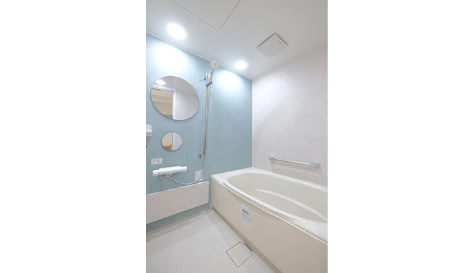浴室は、ご希望によりお手入れのしやすいシンプルな仕様のユニットバスを採用。カウンターは、折りたたんでおくことも、取り外して洗浄することも可能です。ブルー系のアクセントパネルが清潔感を演出しています。