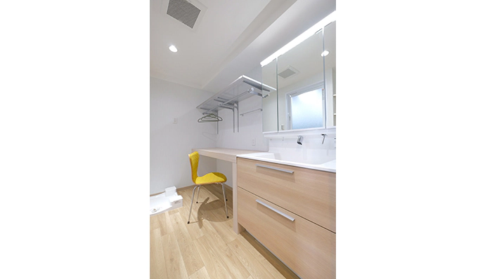洗面室は、新しくした洗面化粧台の横にカウンターを造作し、可動棚やハンガーパイプも設置しました。カウンターでは、洗濯物をたためるほか、アイロンなども使えるようコンセントを増設しました。