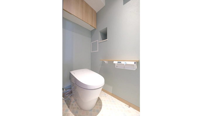 トイレは、タンクレストイレに替えることで、空間が広く使え、お掃除もしやすくなりました。壁は全面に淡いブルー系のクロスを採用し、落ち着きのある空間としました。