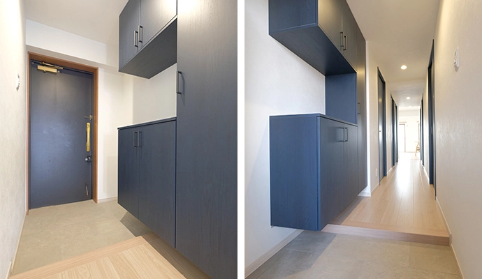 Sさまは、ご友人が玄関のたたきを広げるリフォームを行い、その便利さを実感されておりご自身も採用を決断されました。そこで、玄関収納の位置を変更し、たたきを広げることで、濡れた傘や靴を置けるスペースを確保。さらに、フロートタイプの収納を採用し、すっきりとした印象に仕上げました。