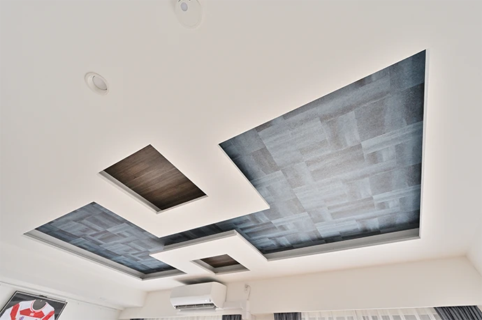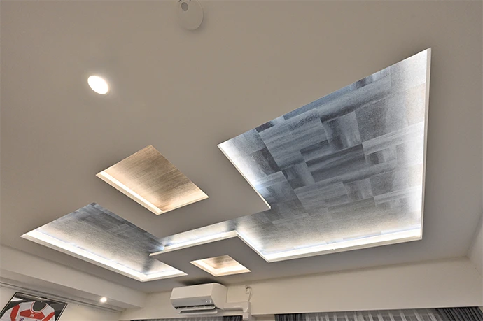 天井の照明をすべてダウンライトにして圧迫感をなくしたいというご要望がありましたが、配線や器具を設置するために天井の高さを少し下げる必要がありました。そこで、天井に高低差のある折り上げ天井を採用し、天井が高くなっている部分にアクセントクロスを張って視覚的にも奥行きが感じられるように工夫しました。また、折り上げ天井のそれぞれで照明が点灯するようになっているため、お部屋の明るさや気分に合わせて光の演出を楽しめます。