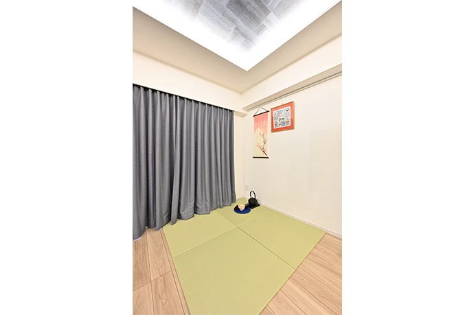 和室をなくした代わりに、リビング・ダイニングの一角に、ご主人さまの趣味である茶道のための畳コーナーを設けました。使用しない時には収納のできる置き畳を取り入れています。壁にはピクチャーレールを取り付け、壁に穴を開けずに額などを掛けられるようにしました。