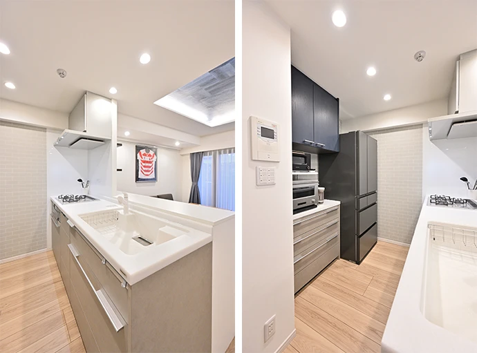L字型の壁付けキッチンをオープンキッチンに変更。システムキッチンは、有機ガラス系の素材のカウンターやレザー調の面材を用いた扉などの掃除のしやすさに加え、快適性、デザイン性を兼ね備えたものを採用しました。また、キッチンの背面に調理家電や普段使いの食器を収納できる食器棚を設置することで、調理の作業効率が向上しました。