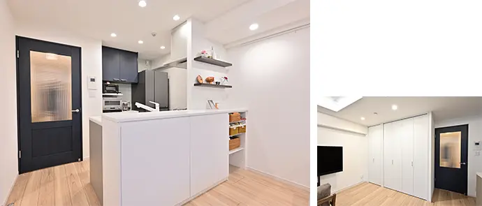 リビング・ダイニングの扉と視線がつながる食器棚上部の扉には、Yさまのお好みのネイビーブルーを採用。リビング側のキッチンカウンターの下部には、小物や書類の収納スペースを設けました。また、リビングの収納は、食材のストックや生活用品、お掃除用具などを収納できるよう、収納するものに合わせて内部のレイアウトが変更できる可動棚としました。
