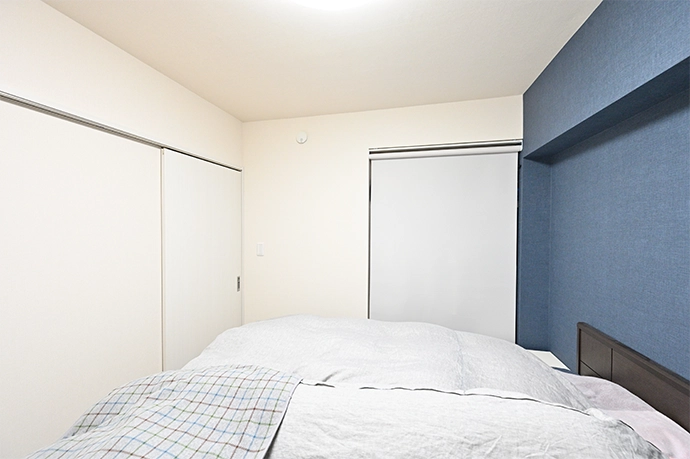 洋室は寝室として利用されています。ネイビーブルーのアクセントクロスを張り、落ち着ける空間を演出しました。2台のベッドを置いても扉がぶつからないように、出入り口を引き戸に変更し、クロゼットの扉は取り外してロールスクリーンを採用しました。