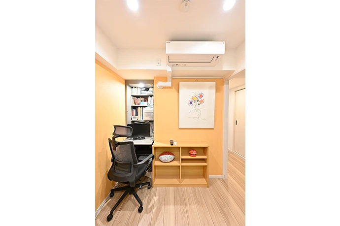 既存の洋室(2)の一部のスペースをワークスペースとして活用。クロゼットだった部分に書類を収納できる棚と折り畳み式のデスクを造作し、限られたスペースを効率的に活用しました。窓からの採光が少ないため、ビタミンカラーであるオレンジ色のクロスを張り、鮮やかで明るい空間を演出。お手持ちの白い絵が引き立つように工夫しました。