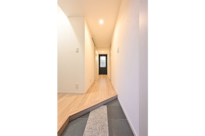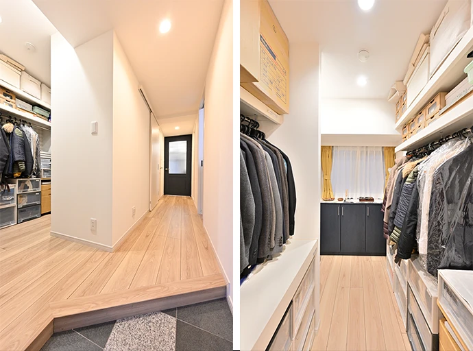 既存の洋室(2)の一部のスペースにウォークスルークロゼットを新設しました。帰宅時は玄関から直接入ることができ、外出時もスムーズに身支度を整えて玄関へ移動可能です。さらに、玄関のかまちを斜めにすることで、より快適な動線としました。