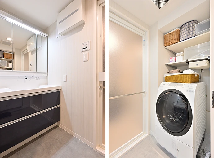 洗面化粧台や浴室などの水回り設備は、数年前にリフォーム済みだったため、洗面室のクロスと床を張り替えて一新しました。洗面化粧台は既存のものを生かしながら、他の部屋でアクセントカラーとして使われているネイビーブルーの扉材をオーダーメイドで制作しました。また、洗濯機置き場の上部には、洗剤などの洗濯用品を収納できるように棚を設置しました。