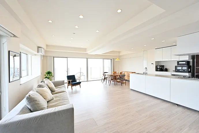 洋室(3)のリビング・ダイニング側にあったクロゼットとデスクをなくし、リビング・ダイニングを広げました。また、独立型のキッチンをオープンキッチンにすることで、さらに広がりのある空間を実現しました。床には明るいオーク柄のフローリングを採用し、白いクロスと組み合わせて開放的な空間を演出。リビング・ダイニング全体を快適に温めるよう、床暖房の設置範囲を広げました。