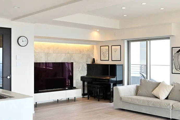 リビング・ダイニングの新たに広げたスペースは、家族で寛げるテレビコーナーにしました。背面の壁は、石目調の調湿建材を張って空間のアクセントとしました。TVボード上部には間接照明を設置し、梁の圧迫感を和らげるよう工夫しました。さらに、ピアノを置く床には補強を施しています。