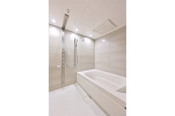 浴室には、ハンドシャワーに加えてオーバーヘッドシャワーやボディシャワーも備えました。カウンターを設けず、シンプルですっきりとしたデザインにすることで、お手入れのしやすさにも配慮した空間に仕上げました。