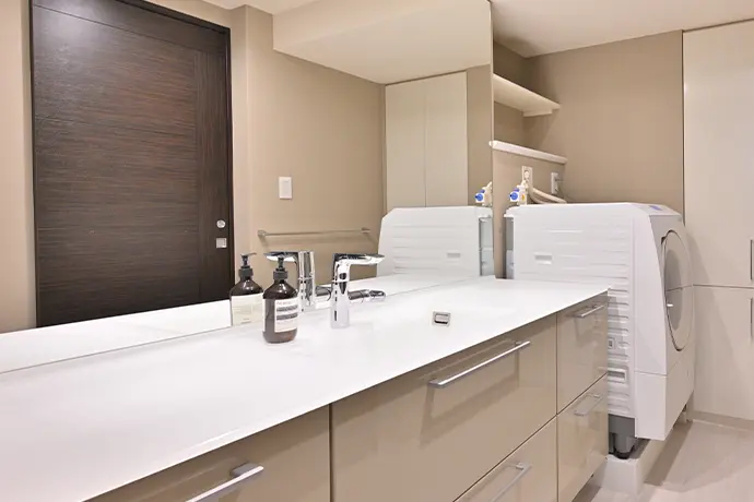 洗面室は、洗面化粧台と洗濯機の間にあった壁を取り除き、圧迫感のない開放的な空間に。洗面化粧台は一枚鏡を設置し、すっきりとした印象に仕上げました。鏡の裏に収納を設けないことで、前方への張り出しがなく、より広く感じられる空間になりました。また、洗面化粧台の収納は、奥に入れたものも取り出しやすい、引き出し型を採用しました。