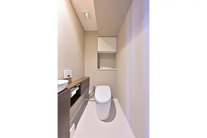 Sさまのお好みのクロスとCFシートでスタイリッシュに仕上げ、その雰囲気に合うよう、ホテルライクな新しい手洗い器に替えました。