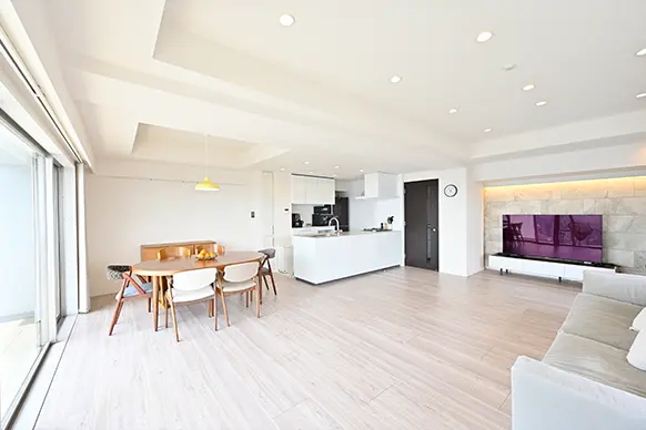 Sさまは、ご夫妻とお子さま3人の5人家族。こちらのマンションには新築時から賃貸で入居され、周辺の環境や居住者同士のコミュニケーションも良好なことから、大変気に入っていたお住まいでした。お子さまの成長に伴い、大きなリビング・ダイニングがあり、広い子ども部屋が確保できる家に移りたいとお考えでしたが、棟内で条件に合った売却物件が出たことから、お住み替えに。その後、せっかくならリビングをさらに快適にし、設備やインテリアも気に入ったものに変えたいと、リフォームのご相談をいただきました。そこで、既存の建具など生かせるものはそのままに、住み心地を高めるリフォームをご提案。キッチンはオープンキッチンに変更し、また、各々の洋室はお子さまたちが快適に過ごせるお部屋に整えました。家族のつながりを大切にしつつ、それぞれが自分の時間を過ごせる、心地よい住まいが完成しました。