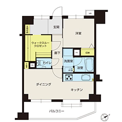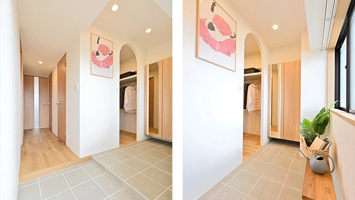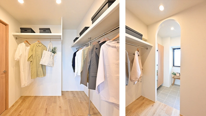 洋室(1)をなくして新設したウォークスルークロゼットは、廊下と玄関のどちらからでも出入りできるようにしました。玄関側の入り口は、柔らかな曲線を描くアーチ型にすることで、おしゃれなゲート風に演出。外出時も帰宅時にも、このクロゼットを通りながら、上着のお着替えやコーディネートが楽しめ、衣類をすっきりと片付けられるよう考えた動線となっています。