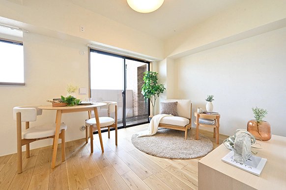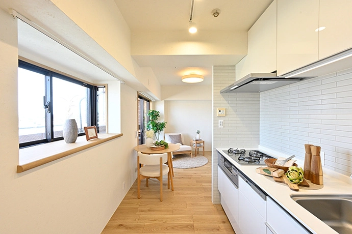 日々のお手入れのしやすさを考慮し、天然素材の優しい風合いを取り入れた漆喰(しっくい)調クロスを採用。明るい色調のフローリングと組み合わせることで、ナチュラル感のある素材に包まれた、清潔さと落ち着きが感じられるダイニングに仕上げました。バルコニーからの日差しや観葉植物の緑も、美しく映える空間となっています。