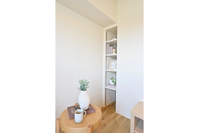 ダイニングのパイプスペースと壁の間にある棚。今回のリフォームでは、まわりのクロスに合わせ、棚の色も白にそろえました。さらに、以前の固定棚から、飾りたいアイテムや収納物のサイズに合わせて高さを調整できる可動棚に変更しました。
