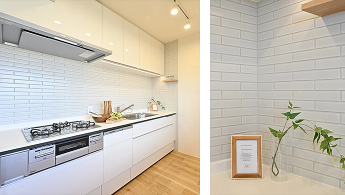 収納が少なく調理スペースも狭いことが悩みの種だったキッチンは、壁いっぱいの幅があるシステムキッチンに交換。吊戸棚も増設して、収納不足を解消しました。併せて、キッチンのバックパネルは素材感のあるタイル張りに変更。お料理をする時間が楽しくなるようなキッチンに生まれ変わりました。