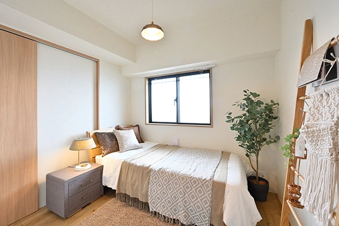 洋室は、室内に飛び出していた玄関収納のスペースを撤去し、ベッドが置きやすくなるようにお部屋の形を整えました。さらに、扉は引き戸に交換。サイドテーブルなどが置ける空間を確保したことで、お休み前の時間をより楽しむことができるようになりました。