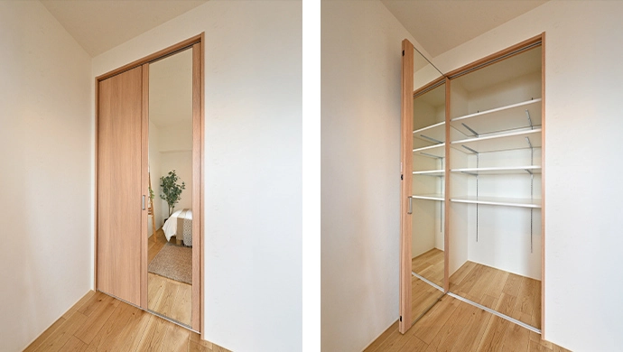 洋室の一角には、以前のクロゼットに替えて収納を造作。内部のハンガーパイプを、いろいろなアイテムが置ける可動棚へと変更。交換したナチュラルな木目の収納扉は、大きな姿見付きのものを採用しました。