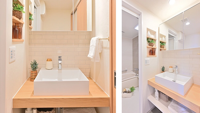 洗面室は、「デザイン性のある洗面化粧台にしたい」とのご要望に応え、木目調の天板の上に置き型ボウルを設置。さらに、木製天板のニッチ(飾り棚)を造作し、正面の壁をタイル仕上げとすることで、ナチュラルな素材感で統一された空間にしました。