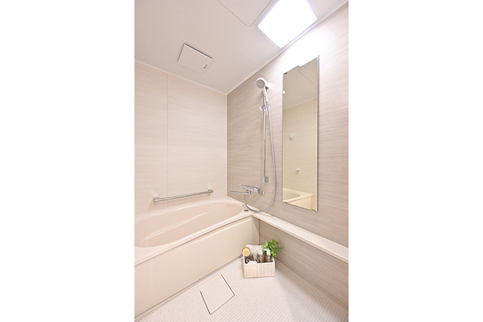 浴室は、ご要望により、お掃除がしやすいシンプルなユニットバスに交換。居室と同じように、浴室もナチュラルで落ち着いた色調のアクセントパネルを採用しています。