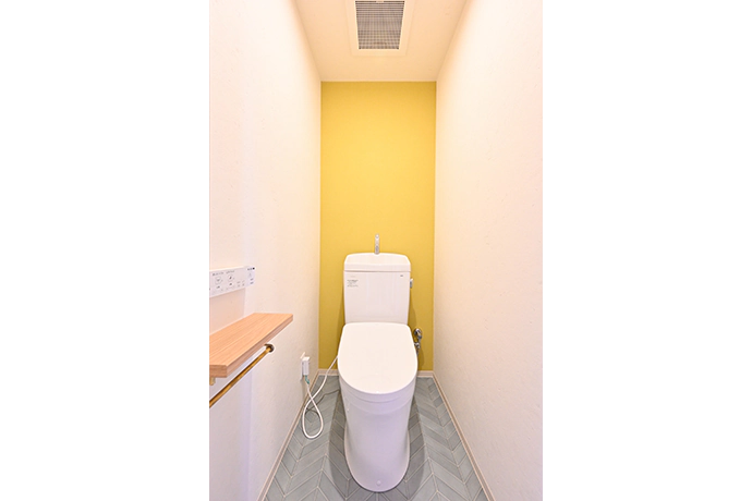 トイレは、お掃除がしやすい新しい製品に交換。床は洗面室と共通のタイル調CFシートに替え、アクセントクロスにはビタミンカラーを採用することで、明るさの感じられる居心地のよい空間にしました。