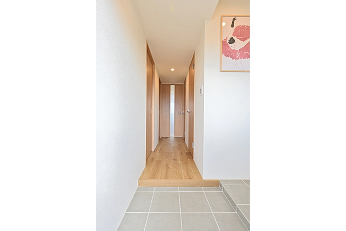 廊下も、居室と同じフローリングと白い漆喰(しっくい)調クロスとし、建具もすべて同系のナチュラルブラウンでそろえ、統一感を演出しました。ダイニングへつながるドアは、一部を透明な素材とすることで、ダイニングからも廊下に光が差すよう工夫しています。