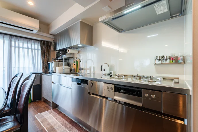 キッチンは、スタイリッシュなステンレス素材を採用したデザイン性の高い仕様に。従来の半独立型から、空間をより広く活用できる壁面キッチンへと変更し、開放感と機能性を両立しました。