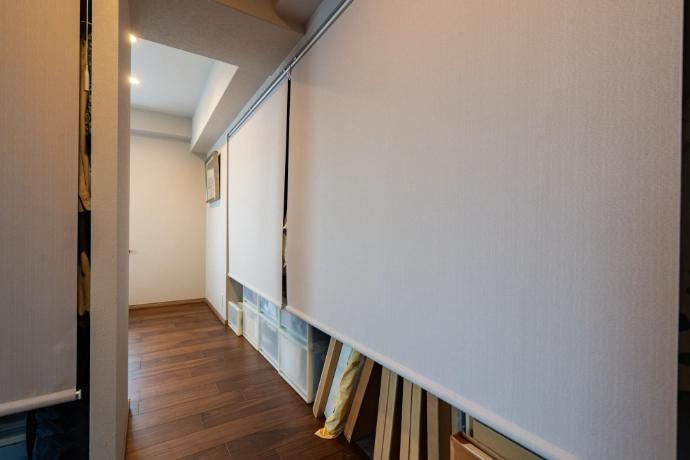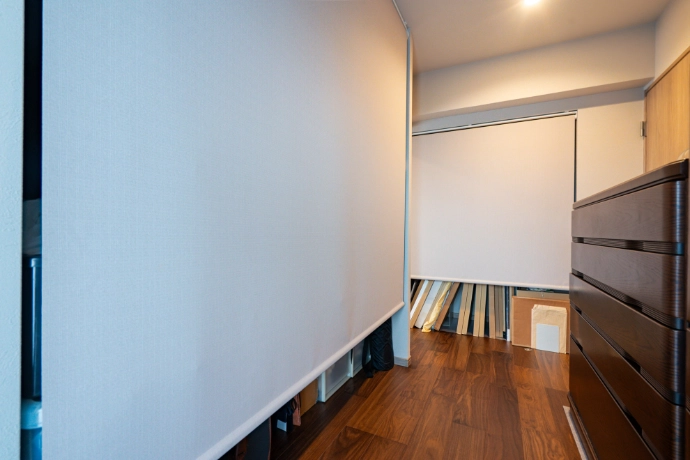 洋室(1)はお部屋の中央にクロゼットを新設し、空間を仕切ることでベッドスペースと収納スペースを確保。収納スペースはお持ちのたんすを活かしながら、大容量の収納を実現し、絵画や季節の衣類をまとめて収納できる使いやすい空間に仕上げました。