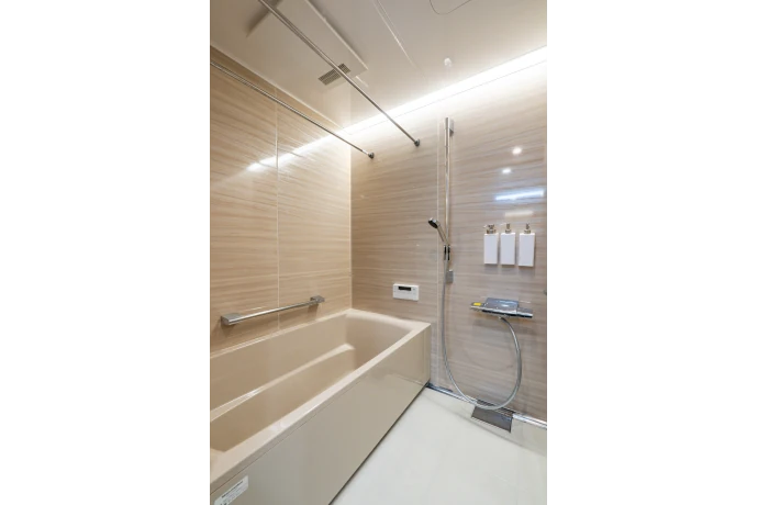 浴室は「掃除がしやすい空間にしたい」というご要望に応え、壁面に固定棚を設けず、すっきりとしたデザインに。さらに、マグネット対応の壁を採用することで、必要なアイテムを自由に配置できる機能性を実現しました。シンプルで清潔感のある、快適な浴室が完成しました。