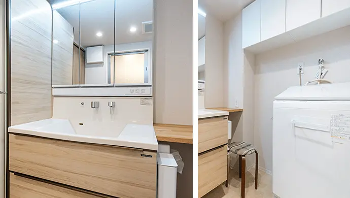 洗面室は、浴室との位置を見直してスペースを広げました。タオルなどを収納できるスペースを新設し、さらに洗濯機上部には吊戸棚を設置しました。加えて、座って身支度ができるカウンターを取り入れ、使いやすさと快適さを両立した洗面空間が完成しました。