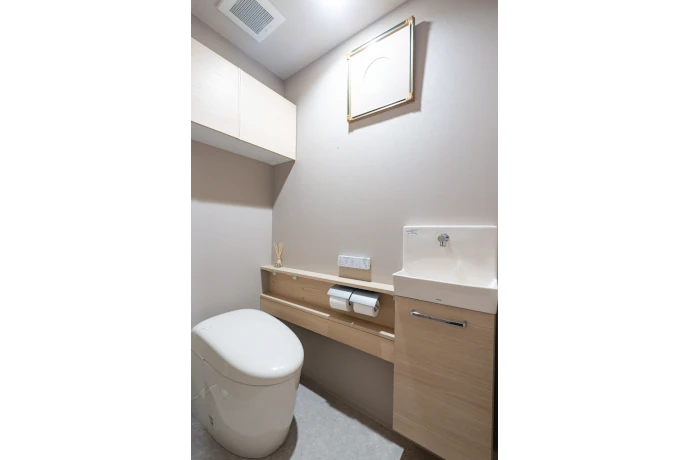 トイレは、掃除のしやすいタンクレスタイプを採用。さらに、手洗いスペースを設けました。シンプルで清潔感のある空間が完成しました。