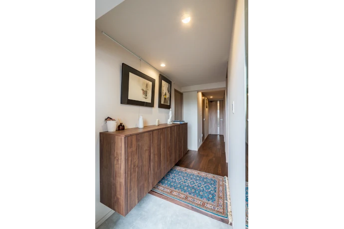 玄関は、入った瞬間に目線が自然と絵画に向くように廊下を広げ、腰高のシューズボックスを配置。その上にはピクチャーレールを設け、アートを飾れるスペースを確保しました。