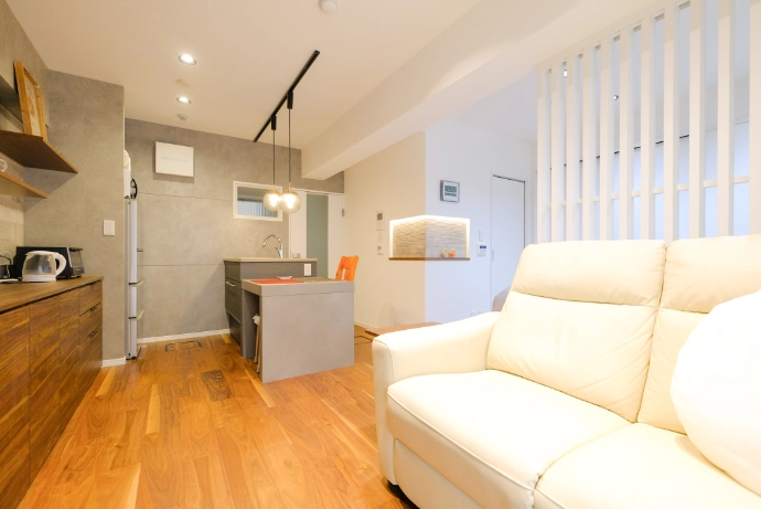 限られた空間を有効活用するために、和室をダイニング・キッチンとつなげて一続きの空間に変更しました。ベッドスペースとの仕切りには縦格子を採用し、空間をゆるやかに仕切りました。キッチン・ダイニングスペースでゆっくりとくつろげるようにソファを配置し、床には冬でも快適に過ごせるよう床暖房を設置しました。