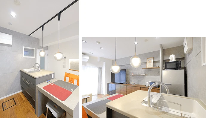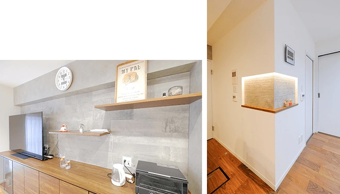 キッチン・ダイニングスペースの壁面には、テレビ台も兼ねたカウンター収納を設けました。壁にはコンクリート調の調湿建材を張り、飾り棚も設置(画像左)。また、部屋の一角に明かりの演出を楽しめるニッチ(飾り棚)を設け、壁面の表情に変化をつけました(画像右)。