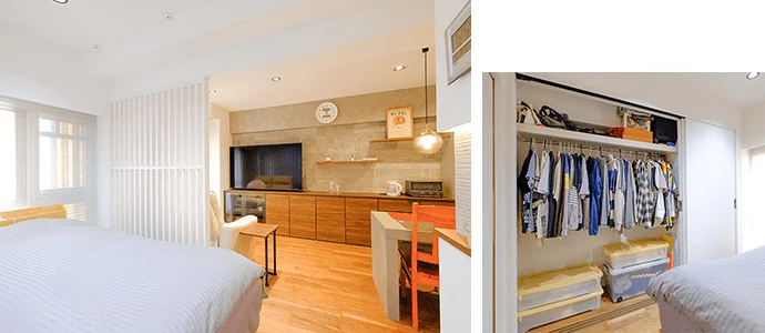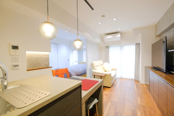 築41年のマンションを、ご自身のライフスタイルに合った住まいへと一新するためにフルリフォームすることを決意されたMさま。約34㎡という限られた空間を有効活用するために、プランナーは1DKだった間取りを開放的なワンルームへと変更するプランをご提案しました。さらに、「自宅の浴室はあまり利用しないのでシャワールームがあればいい」「キッチンは自炊をあまりしないので、ガスコンロは設置しなくていい」などのMさまのライフスタイルを反映し、ひとりの時間を心ゆくまで楽しめる“都会の隠れ家”のような住まいを完成させました。