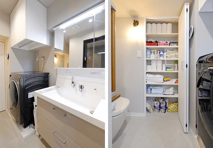 Mさまのご希望に合わせて、サニタリースペースには、大きめのボウルの洗面化粧台を採用。壁面には、タオルやトイレットペーパー、洗剤などをまとめて収納できるスペースを設けました。