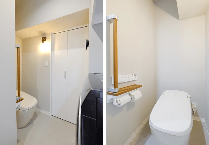 限られたスペースを有効活用するため、トイレは洗面室や洗濯スペースと一体化させたサニタリースペースとして設置。フォルムが印象的なタンクレストイレを採用し、スタイリッシュに仕上げました。
